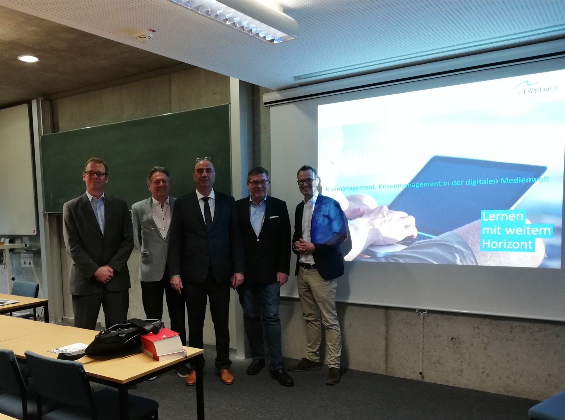 Bernhard Hector (2. von links), Axel Salzmann/Kravag (2. von rechts) und André Spangenberg/Deutsches Zentrum für Krisenkommunikation (Mitte), umrahmt von den Professoren Thomas Haack (links) und Christian Buchmüller
